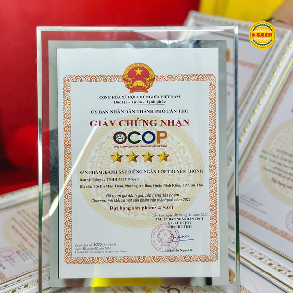 - Chứng nhận OCOP 4 Sao cho nhiều dòng sản phẩm bánh sầu riêng (do UBND TP. Cần Thơ công nhận)
